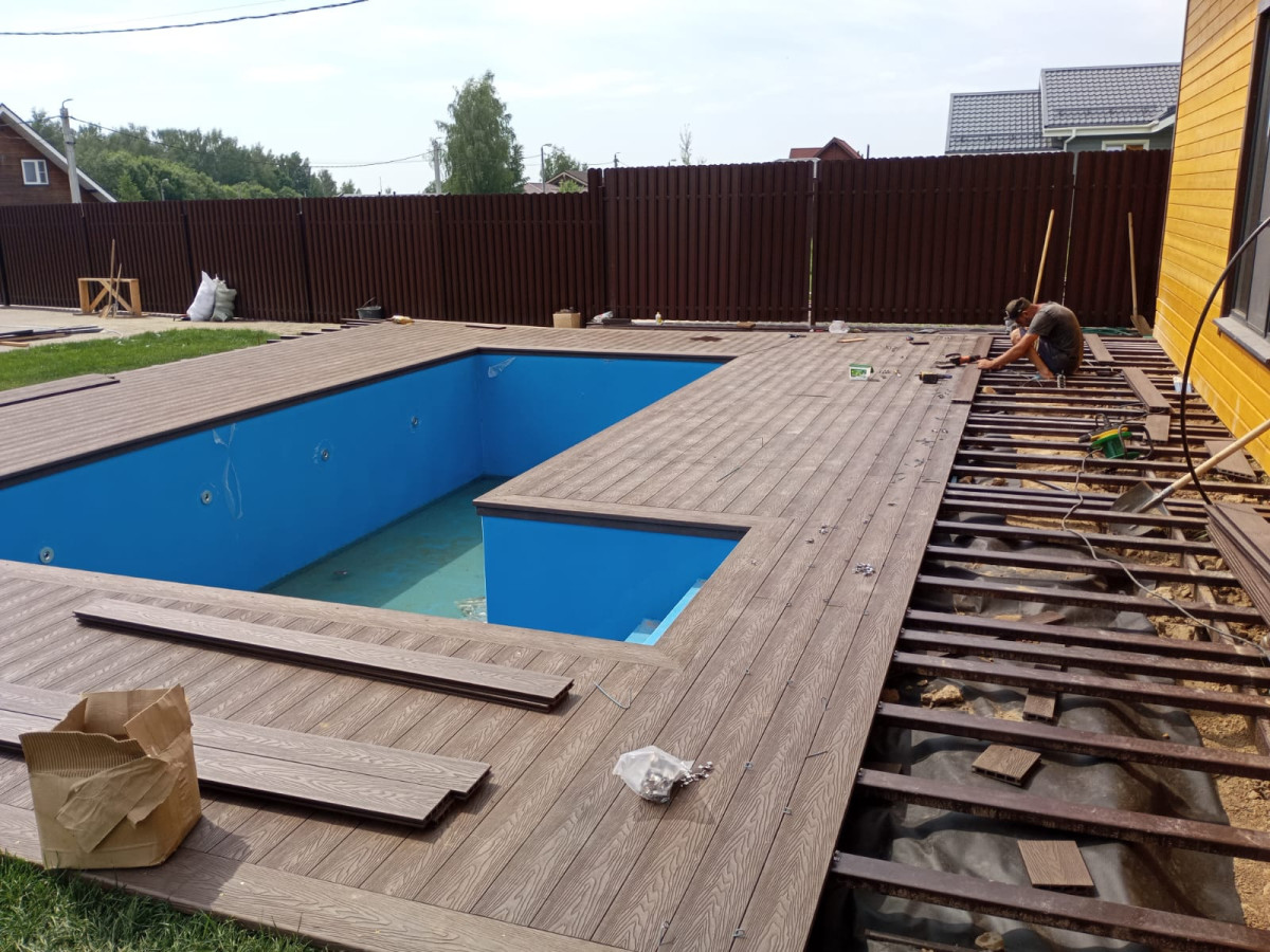 Смонтирован настил у бассейна (металлокаркас на сваях). Торцы зашиты доской. По периметру отделка ступенью шириной 165 мм.