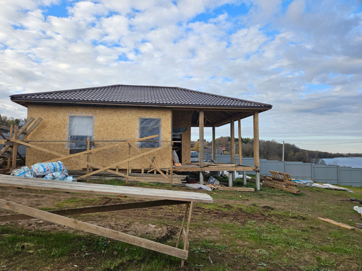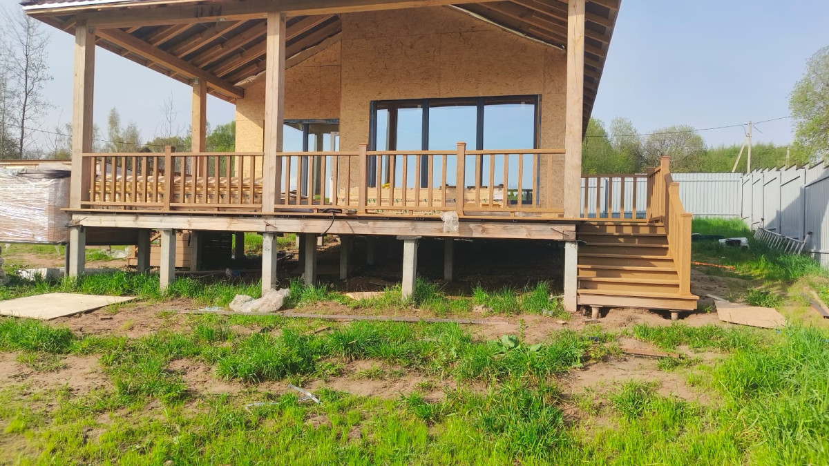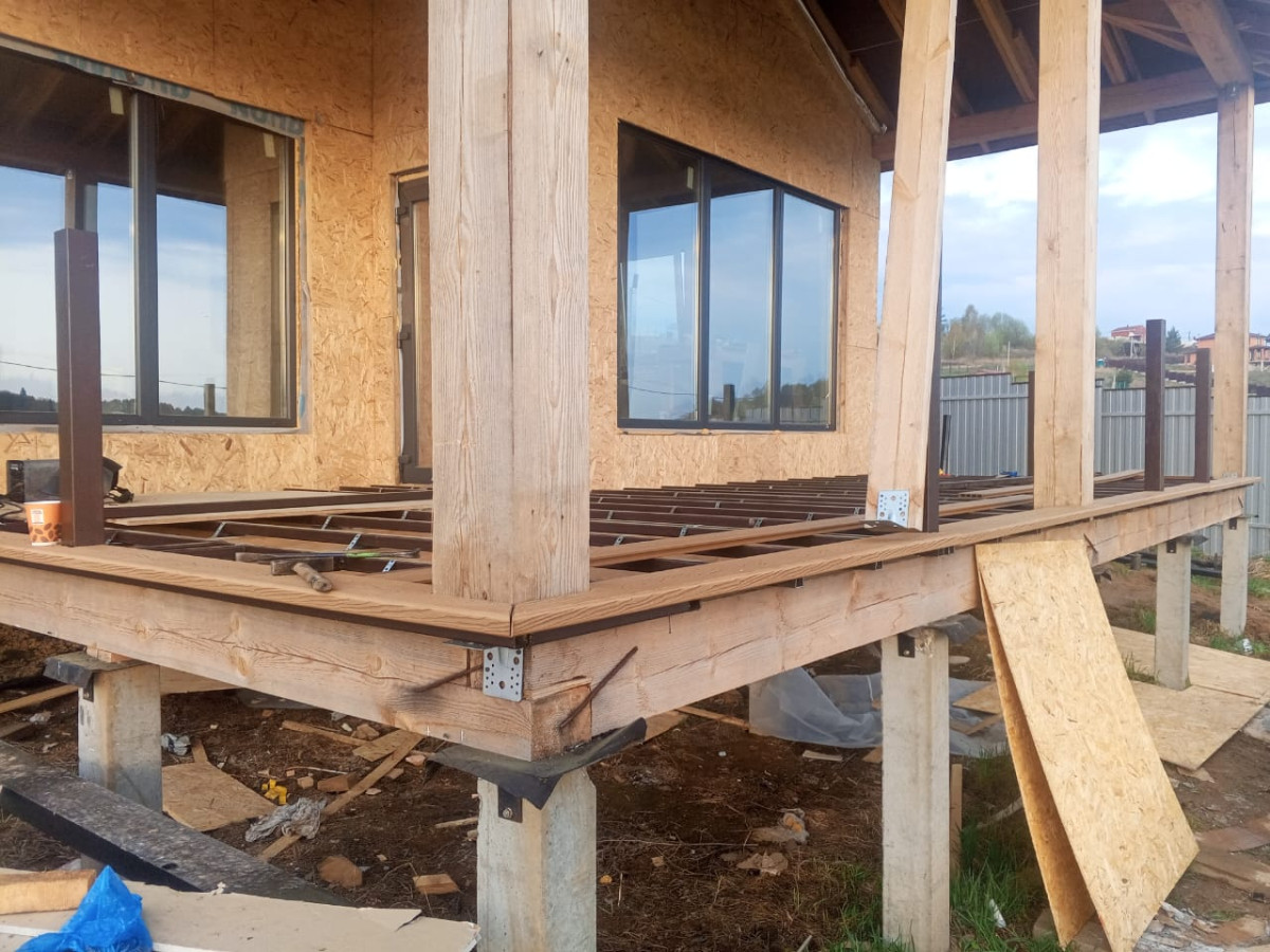 На каркас из бруса установлен металлопрофиль и смонтирована доска. По периметру отделка ступенью шириной 165 мм. Сделаны ступени и ограждение.